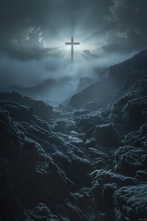 Glowing cross in a foggy, rocky landscape, dramatic and ethereal light