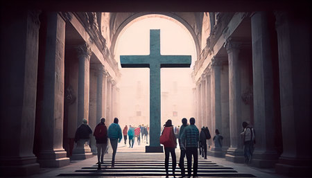 A crowded hall with a large Christian cross. Generative AI technology