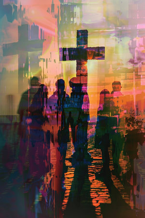 Shadow figure on cross, intense sunset colors, symbolic light, emotional and sacred atmosphere.