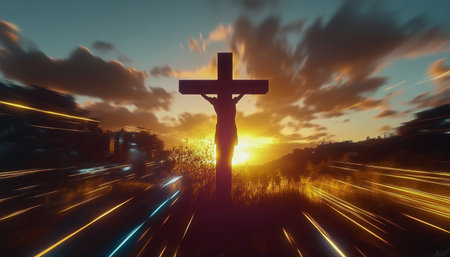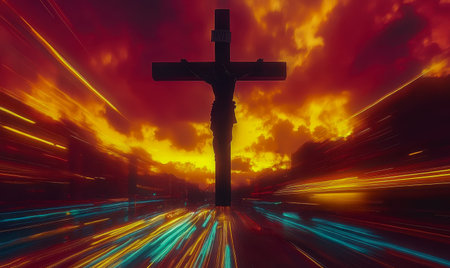 Silhouette on cross against dramatic sunset, fiery sky, powerful emotion, and symbolic light.