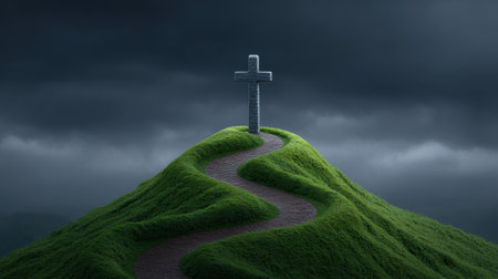 A solitary cross atop a lush green hill stands against a dramatic cloudy sky, inviting reflection and peace. This serene setting captures the essence of spirituality and nature