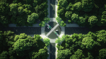 This aerial photograph captures a modern roundabout at the intersection of urban roads, surrounded by vibrant green trees and rich foliage, emphasizing the harmony between nature and infrastructure.