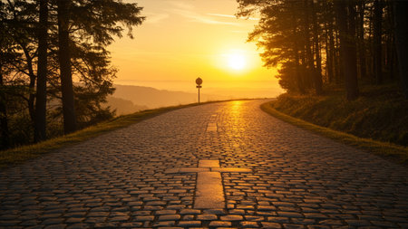 A stunning landscape features a solitary cross atop a hill with a winding road leading towards a captivating sunset, embodying themes of faith, reflection, and the allure of nature.