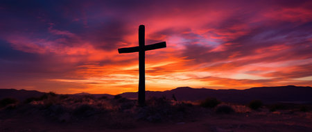Symbolizing Easter and the resurrection of Jesus: A silhouette of a cross on a hill at sunrise. Concept Religious Symbolism, Sunrise Cross Silhouette, Easter Reminder, Christian Faith