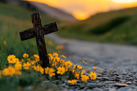 A rustic wooden cross stands amidst yellow wildflowers beside a gravel road. The setting sun casts a warm glow on the scene, creating a peaceful, serene atmosphere.
