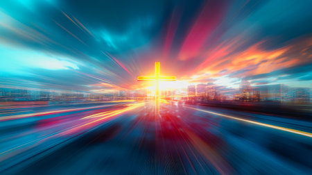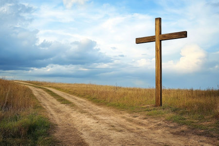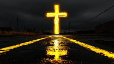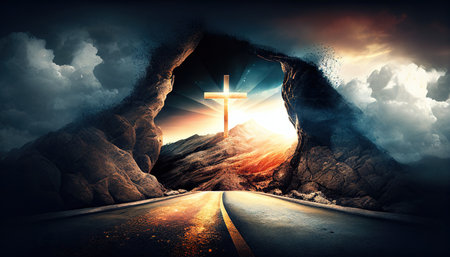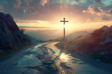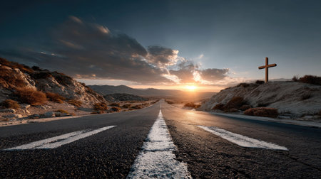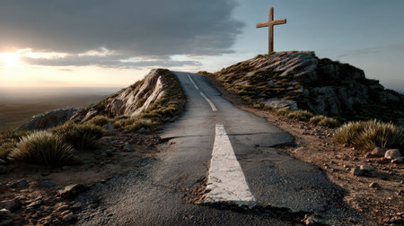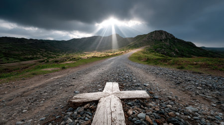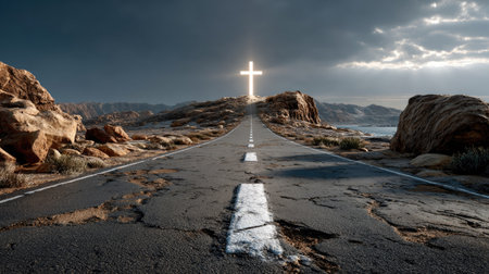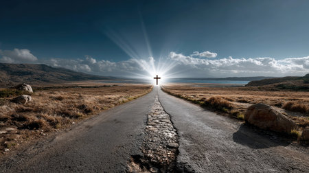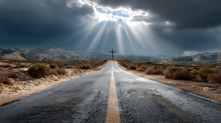 A stunning road stretches toward a radiant cross, set against a dramatic sky and rugged terrain. This serene scene symbolizes faith and a spiritual journey, inviting reflection and contemplation.