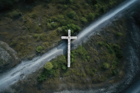 Aerial view of a cross in the middle of a mountain road