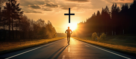 Silhouette of a man jogging on an empty road with a cross in the background