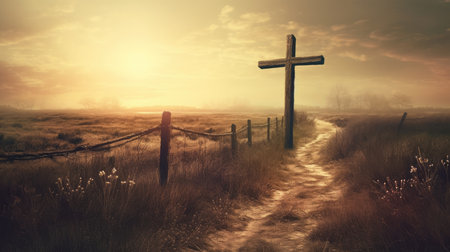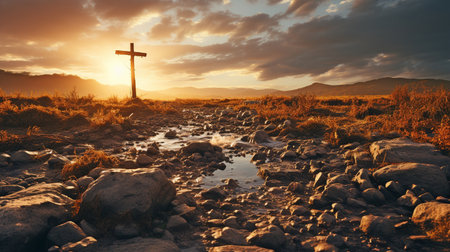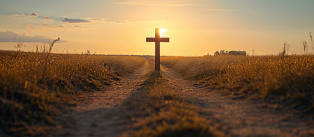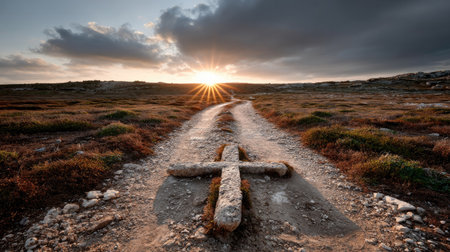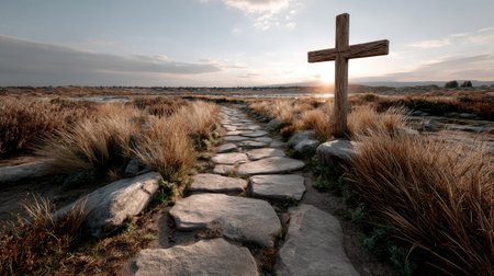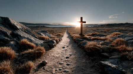 A captivating image showcasing a solitary wooden cross along a dirt pathway leading towards a stunning sunrise. The rocky terrain is adorned with golden grass, evoking feelings of peace, spirituality, and natural beauty in a serene landscape.