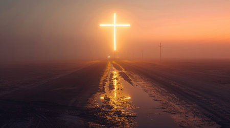 This captivating scene features a cross at the end of a winding road, bathed in radiant light. The peaceful landscape invites reflection and contemplation on faith and journeys.