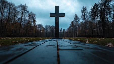 A black cross is in the middle of a path in a forest. The sky is cloudy and the trees are bare