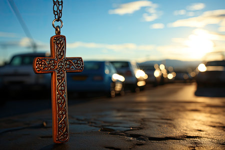 Cross hanging in the mirror, symbol of divine protection., generative AI