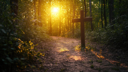 A wooden cross standing on a dirt path in a dense forest, bathed in the golden light of a setting sun, symbolizing serenity and spiritual reflection