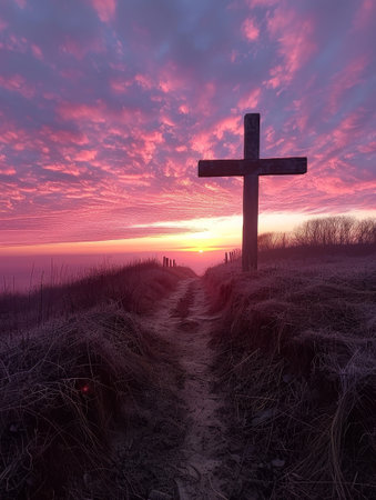 Winding path leads to a solitary cross atop a hill during misty twilight