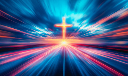 Cross glowing in radiant light breaking through dramatic clouds with heavenly atmosphere.