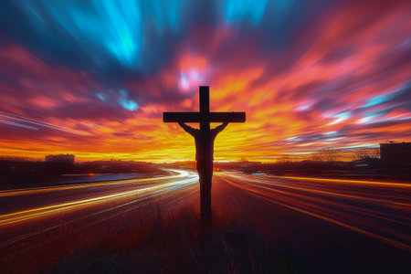 Silhouette on cross against dramatic sunset, fiery sky, powerful emotion, and symbolic light.