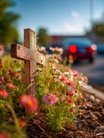 Cross with flowers on the road at sunset. Concept of funeral.