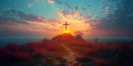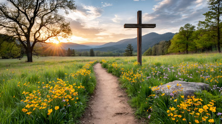 A serene sunset behind a cross amidst a field of wildflowers, symbolizing peace, spirituality, or Easter