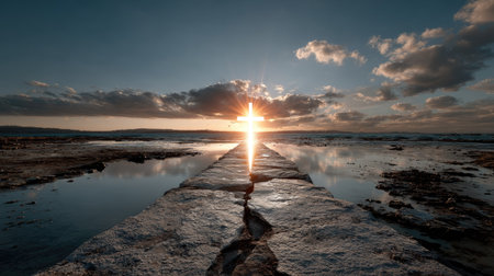 A captivating sunset scene featuring a rocky pathway leading toward the horizon, illuminated by vibrant rays of sunlight. The serene atmosphere is enhanced by reflective water and majestic clouds, creating a tranquil coastal landscape ideal for relaxation.