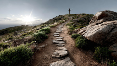 A serene pathway meanders up a hill towards a cross, surrounded by rocks and lush grass under a gentle sunrise, evoking tranquility and inspiration.