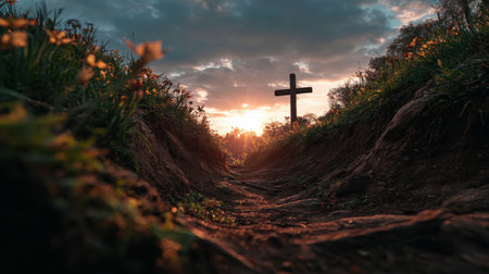 Serene Sunset Scene with Cross Surrounded by Nature and Pathway Leading Towards Horizon Highlighting Spiritual Reflection and Tranquility
