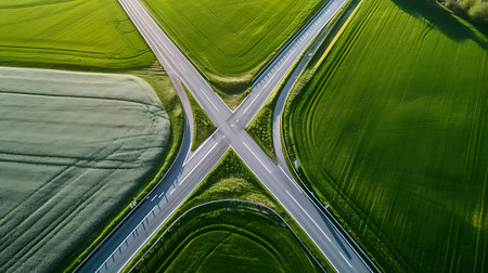 This stunning aerial image captures a crossroad nestled within a vibrant green forest, showcasing the harmony between nature and human infrastructure.