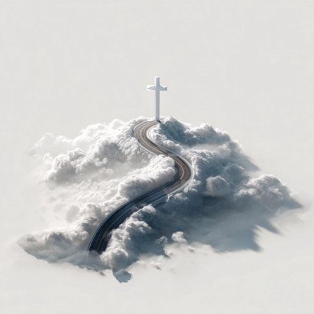 Inspirational road leading to a towering cross above soft clouds during sunrise, symbolizing hope and faith on a spiritual journey