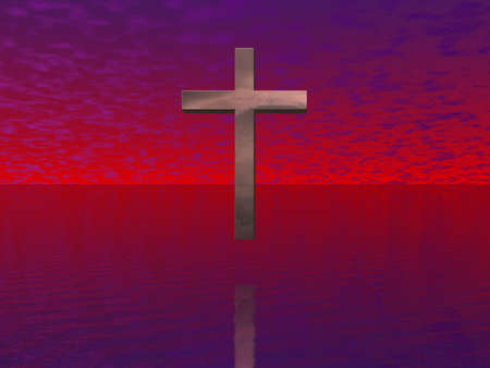 photomontage of cross against silhoretote of mountain and lake view at sunset