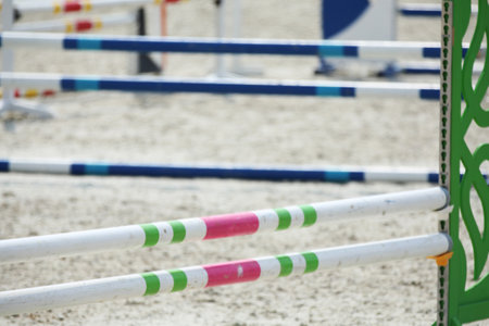 Show jumping poles obstacles, barriers, waiting for riders on show jumping training. Horse obstacle course outdoors summertime. Poles in the sand for equestrian events