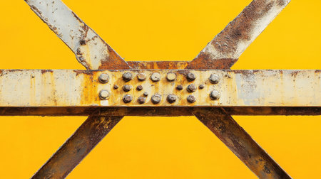 This image features a close-up of rusted metal beams intersecting with a vivid yellow background, emphasizing the contrast and texture. Ideal for designs that require an industrial theme.