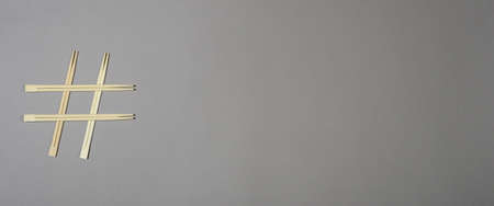 Wooden chopsticks hashtag on grey background. Wide banner. Flat lay, top view. Copy space.