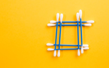 Frame made of blue cotton buds on yellow background