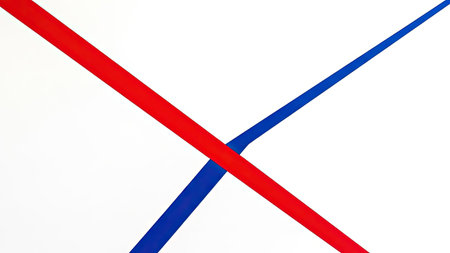 Two colored lines, one red and one blue, intersect on a white background. The composition employs bold geometric shapes. The image exhibits a minimalist style with clean lines and sharp angles. This graphic is suitable for various commercial design applications.