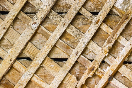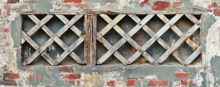 Rustic weathered wooden lattice on distressed painted wall for vintage design