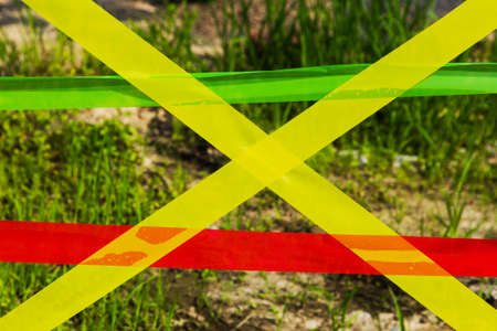 Red yellow green warning tape fencing stretched across the danger zone in the form of a cross.