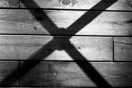 Wooden planks, ribs and screws, railing shadow, black white photo.