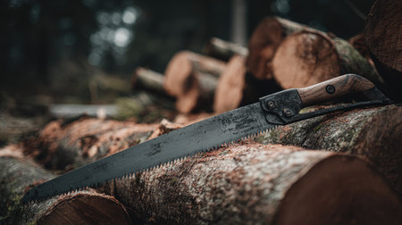 A captivating close-up of a rustic saw resting on a stack of wooden logs in a tranquil forest. The image highlights the details of the tool and natural surroundings.