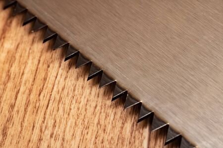 Extreme macro shot of sharp steel hand saw teeth cutting into a wooden board. Detail of woodworking process