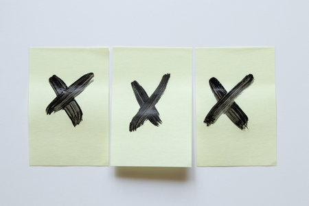 Three black crosses painted with watercolors on three sticky notes placed on a white background