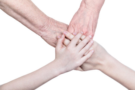 Four female hands folded on each other, symbolizing the four generations, isolated on white background