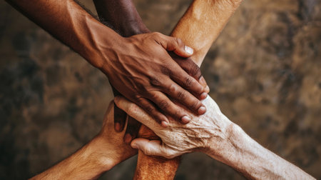 A close-up of intertwined hands of various skin tones, symbolizing unity and diversity, with subtle details that tell a story of friendship and solidarity.