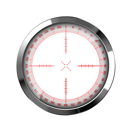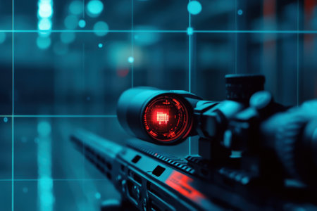 A close-up view presents a digital interface with a prominent target reticle in glowing red against a dark backdrop. The composition features concentric circles and intersecting lines, suggesting a heads-up display. The overall design conveys a modern, technological aesthetic, suitable for use in various commercial and illustrative projects. The scene is illuminated by a bright, artificial light source.