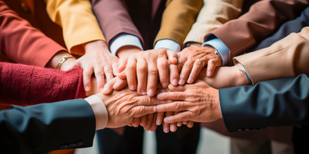 A powerful close-up shot showcasing a multitude of hands from diverse individuals overlapping in a stack. This image powerfully conveys themes of unity, collaboration, teamwork, and mutual support.