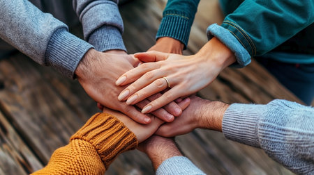 diverse group of people sitting in a circle with their hands gently stacked together, symbolizing unity, support, and connection.