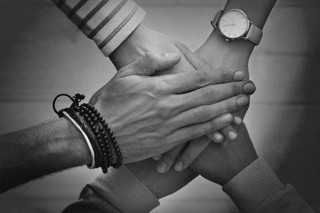 Group of people stacking their hands together, top view. Black-and-white toning