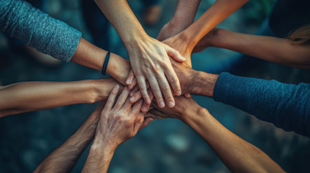 Diverse hands symbolizing teamwork, empathy, partnership, and social connection in business