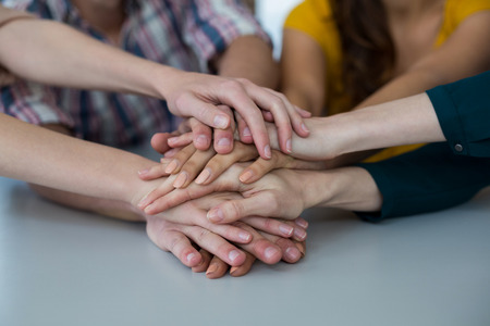 Friends putting their hands together in a sign of unity and teamwork. Just the hands.