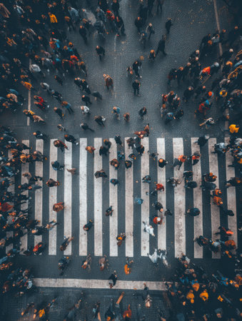 A vibrant aerial view of pedestrians navigating a busy crosswalk in an urban city during daylight.