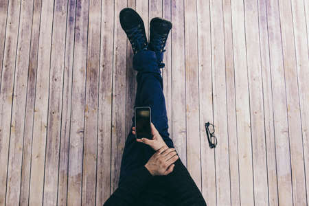 Young woman sitting on the floor at home and using a mobile phone. Directly above