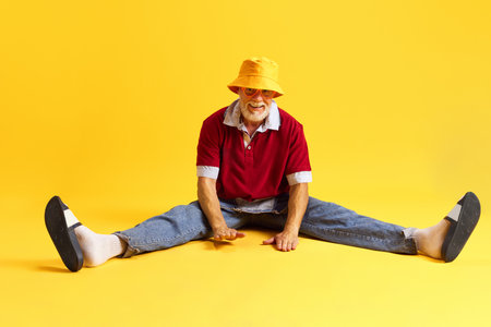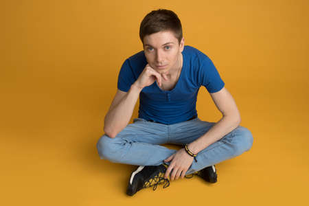 Full length body size view of attractive cheerful funny man dressed denim outfit sitting on floor and having fun isolated bright yellow background. Concept of dashion, style, emotions, holiday. Ad.